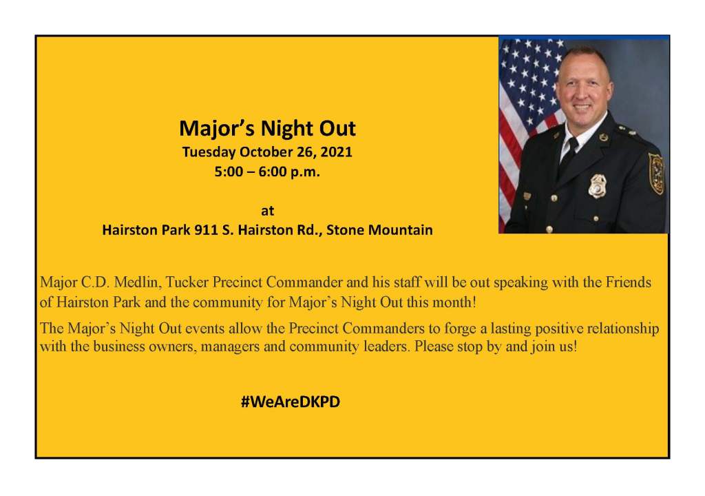 You are invited to hear an update from Major C.D. Medlin, Tucker Precinct Commander, on Oct. 26, 5 – 6 p.m. , at Hairston Park. 911 S. Hairston Road, Stone Mountain. This is part of the Major’s Night Out series, a time when the entire community can address concerns. Please join us.