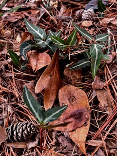 Our work removing English ivy uncovered a native plant called Pipsissewas, which grows in well drained woodlands. This tiny plant, only 1 to 3 inches long, will sprout short stalks with white or pink flowers soon. It is a member of the wintergreen family. Many Native Americans traditionally used it to break up kidney stones and treat various ailments.